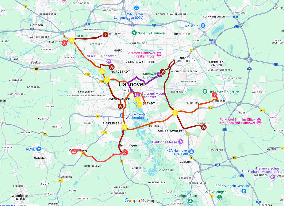 Der Start der Sternfahrt selbst wird um 12:10 vor der Haustür, auf dem Festplatz in Hannover-Marienwerder am Klosterforst sein. Geradelt wird auf der für Autos gesperrter Straße im Schutz von Polizei und Ordnern. Hierfür werden noch Ordner gesucht. Bitte melden Sie sich.